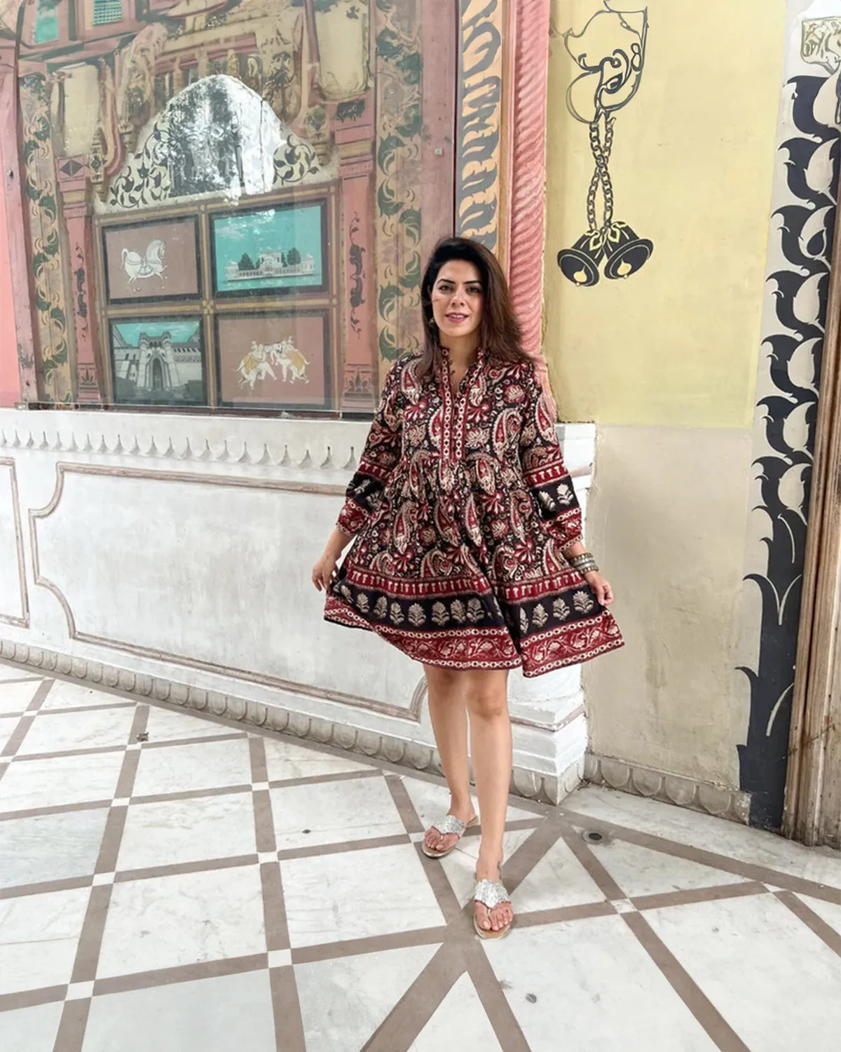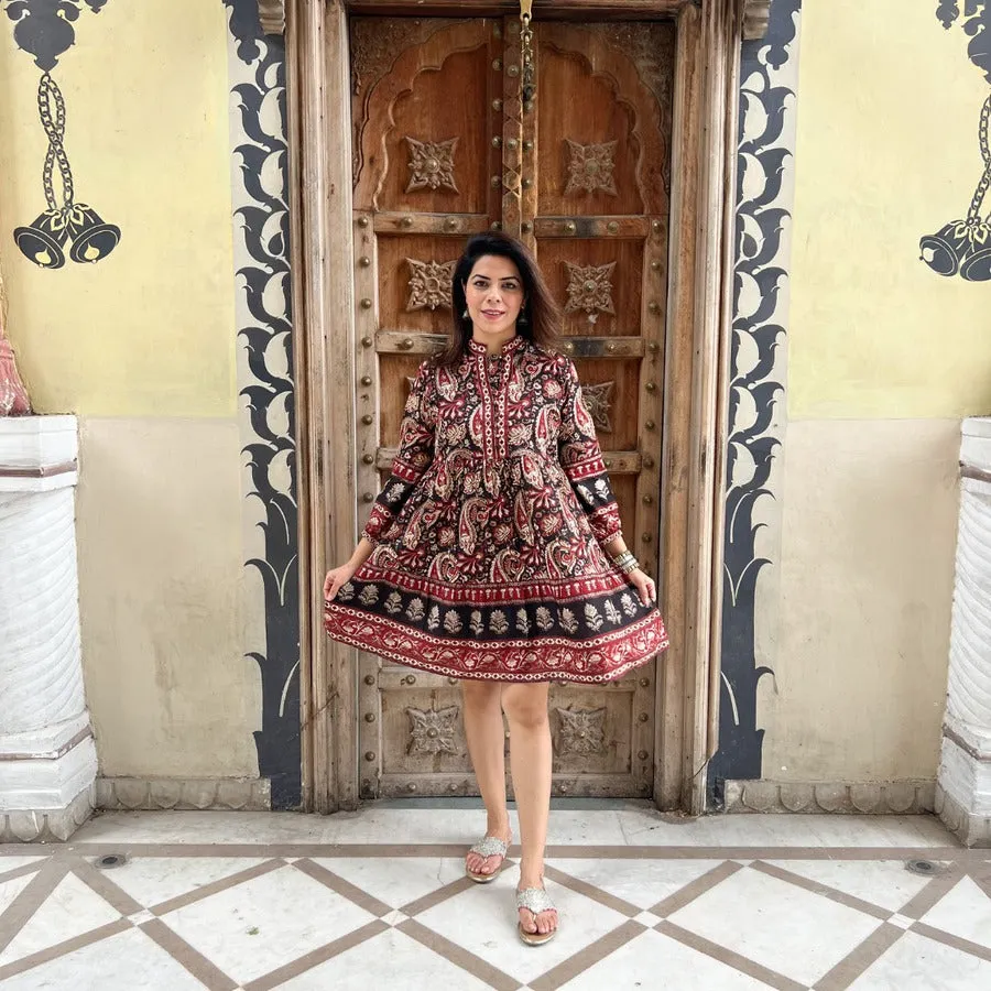 Add some flair to your wardrobe with this stylish Aadhiraat Dress. Crafted from a high-quality Jaipuri cotton, this beautiful midnight black dress features a paisley block print, puff 3/4 sleeves, and a collar detail - perfect for wearing from summer to fall. With its vibrant black and red print, this dress is guaranteed to turn heads. Wear it alone on a warm day or layer with tights and boots when it's cold.