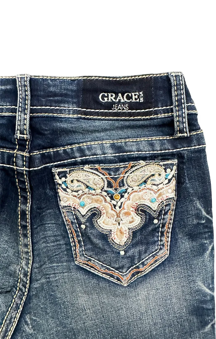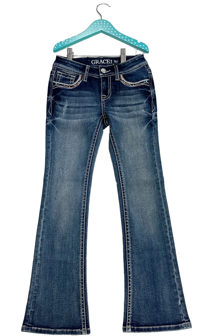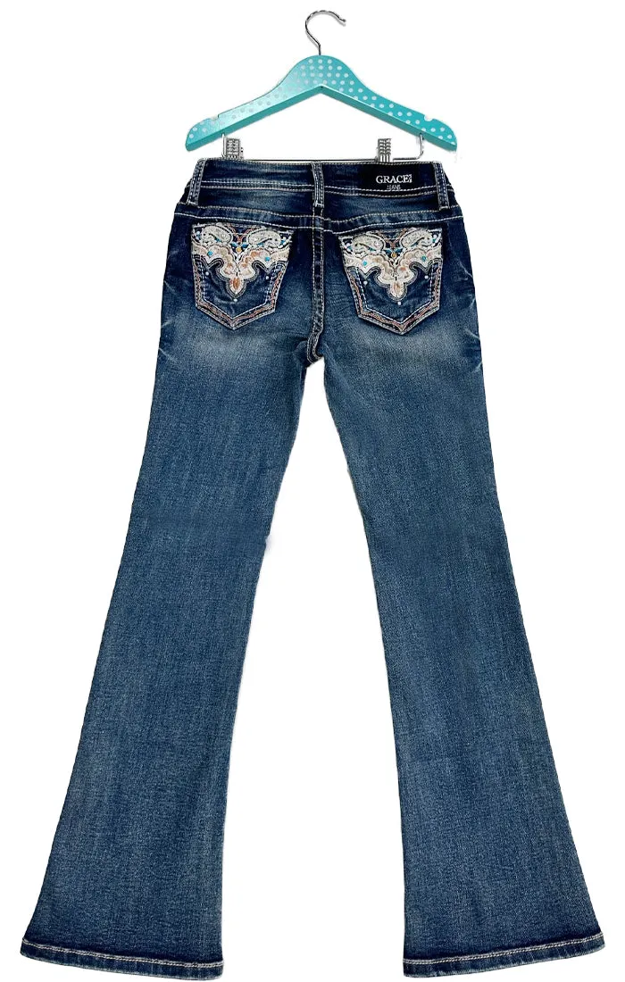 The Grace in LA girls and little girls' jeans come in different fits, we have bootcut, skinny, flare. The jeans are unique detailed with embroidery, western stich, and accent sequins. All natural washes with natural hand sanding and whickering. These jeans make every girl and little girl feel special and comfortable.