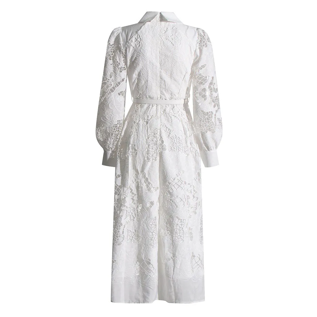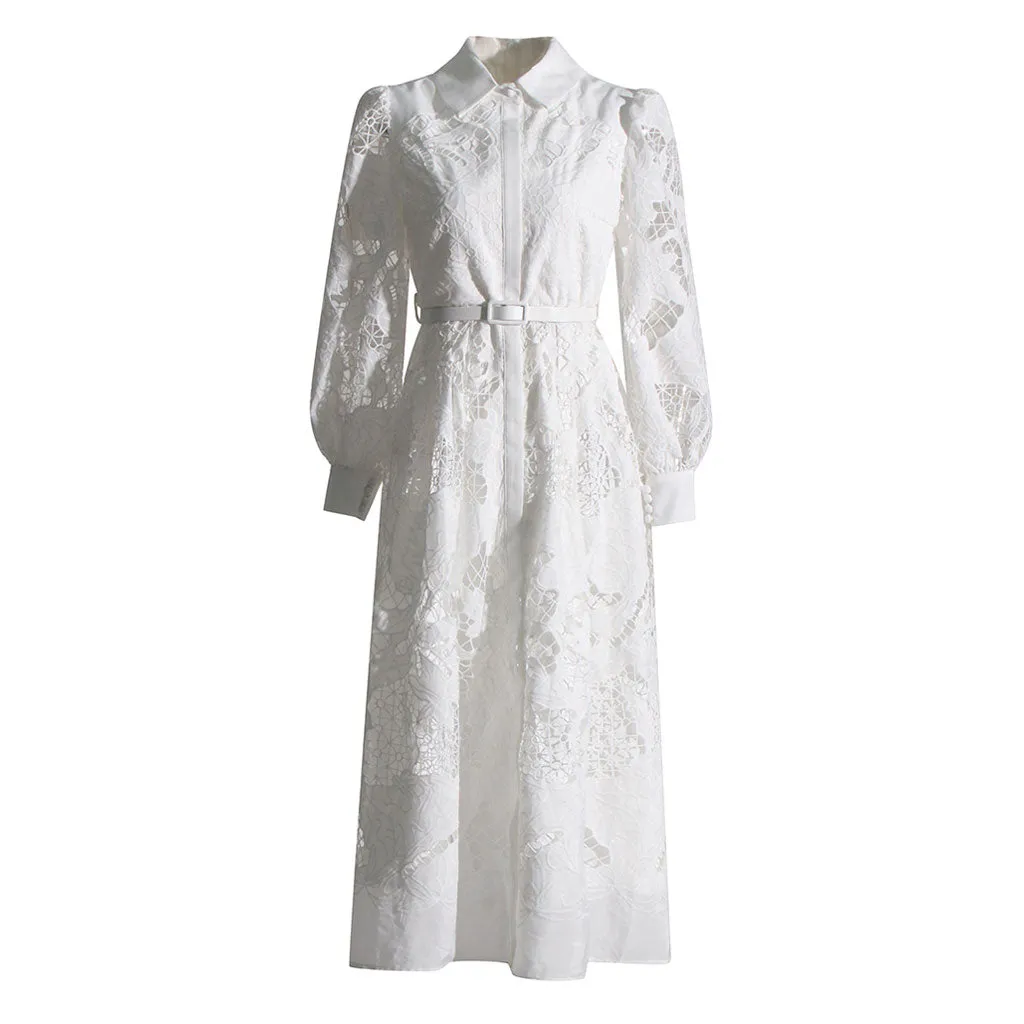 Walk into elegance wearing our graceful designer cutwork midi dress that's both dreamy and delightfully demure. This quiet luxury little white dress features a classic collar and ruffled-trim balloon sleeves with buttoned cuffs. The button-down front and cinched waist belt enhance its flattering silhouette, while intricate floral lacework infuses a timeless boho charm. A front slit combines sophistication with easy movement. Crafted from cotton and polyester, this solid white long-sleeved shirt dress is perfect for vacations, weddings, garden parties or afternoon cocktails where grace is paramount.