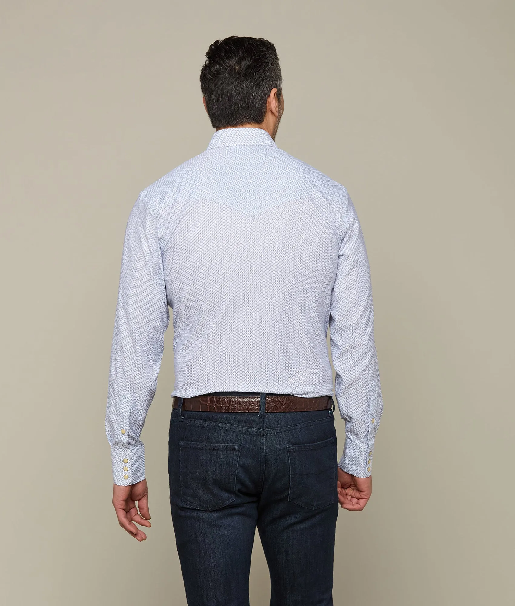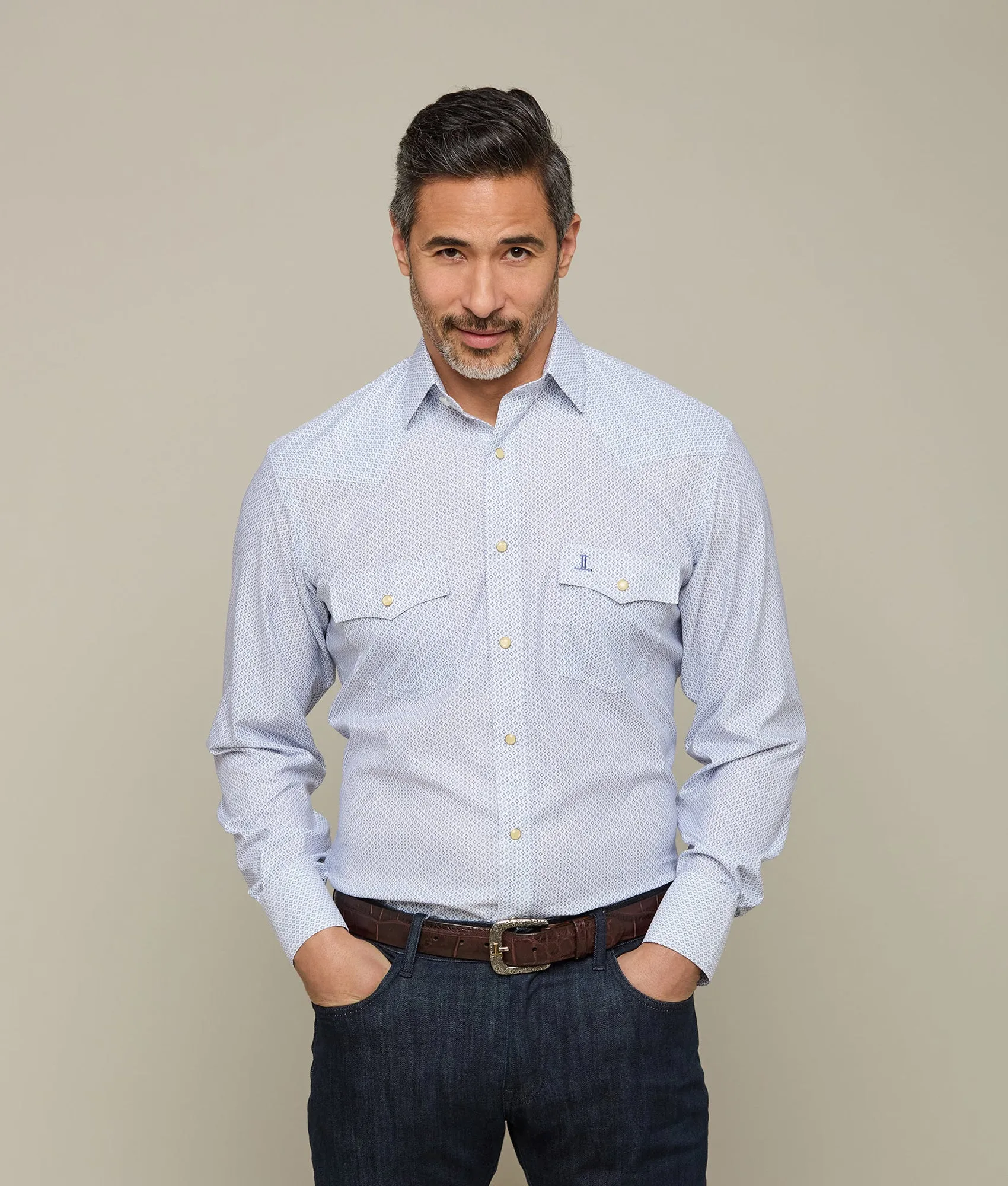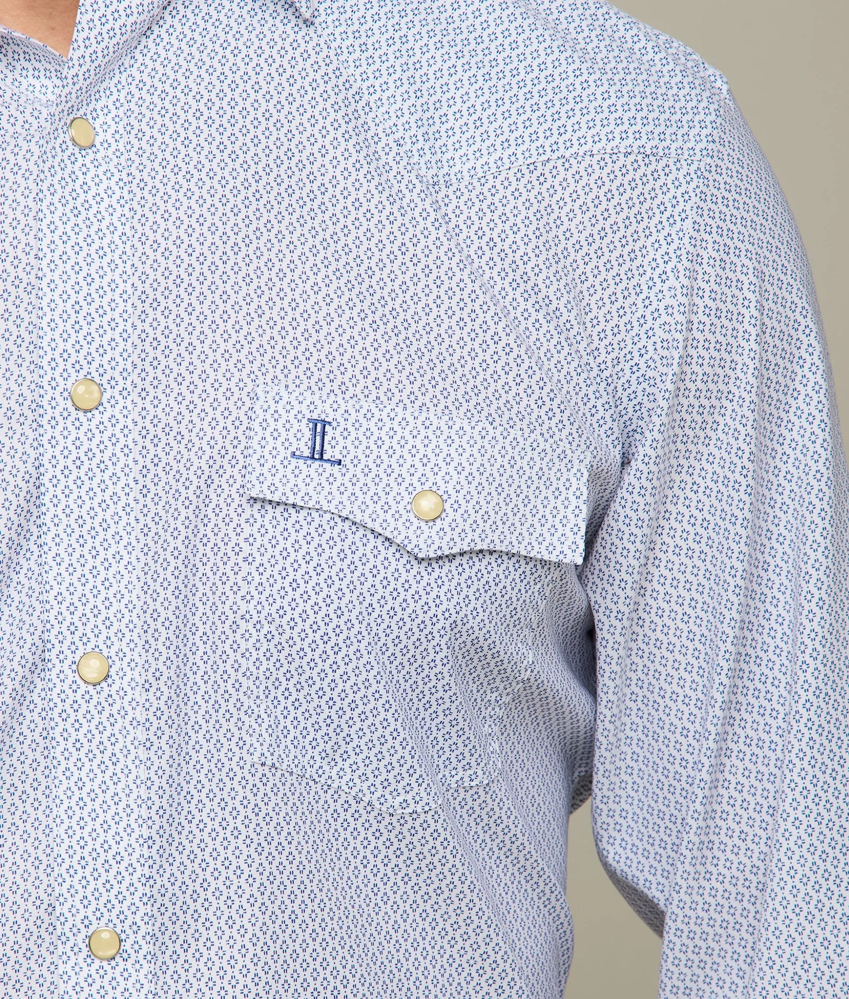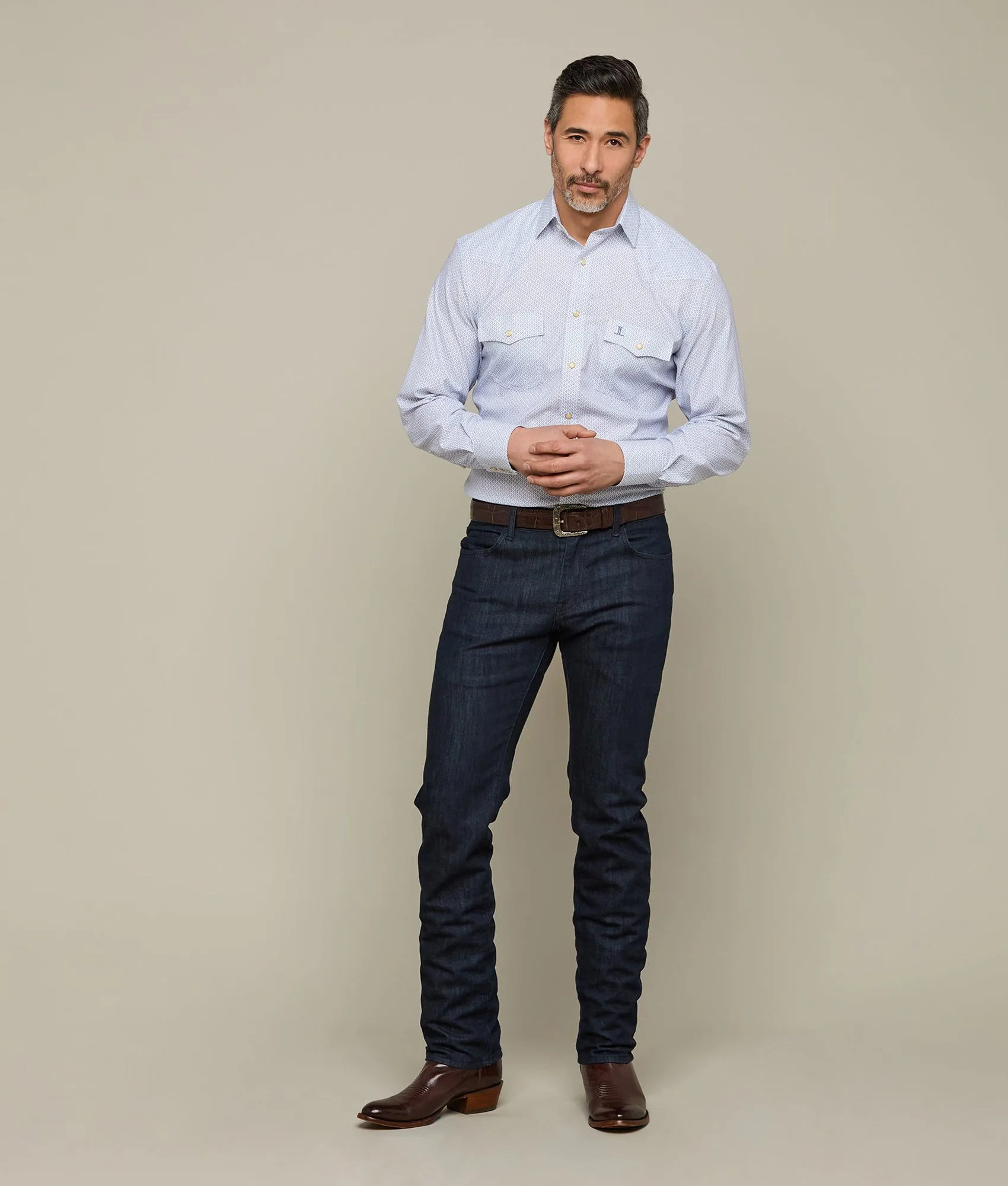 Named for our El Paso factory, this rugged, cotton western shirt features a cowboy yoke in front and back with a subtle, embroidered mirrored-L emblem on the left pocket and lower placket. Classic cowboy fit.