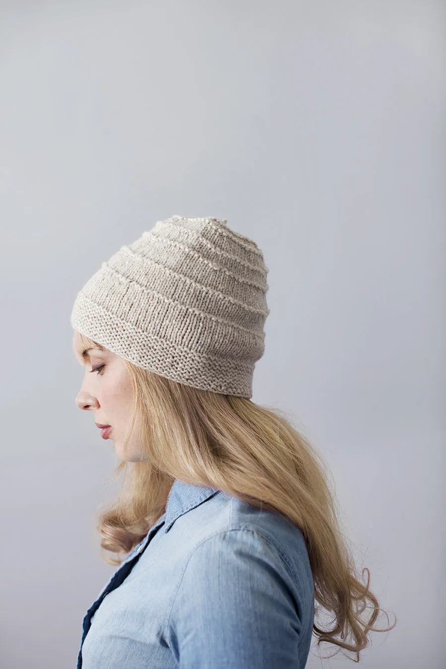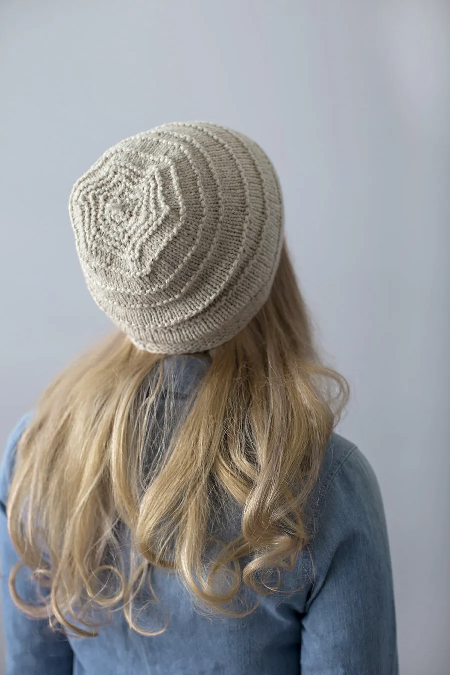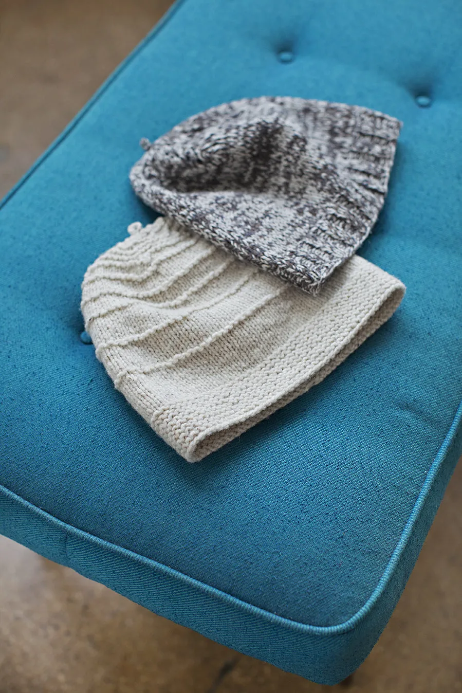 “This hat was inspired by cozy Scandinavian simplicity, and I hope to wear it someday on an adventure in the fjords of Norway. Purled ridges came into the design as a way of hiding the decrease rows that give this hat its special just-slouchy-enough fit, and the tonal striped look was an added bonus. The garter stitch star shape at the top of the hat is formed by a simple arrangement of decreases. My design and construction philosophy tends toward keeping things as simple as possible without sacrificing special details.” – Jenny Gordy