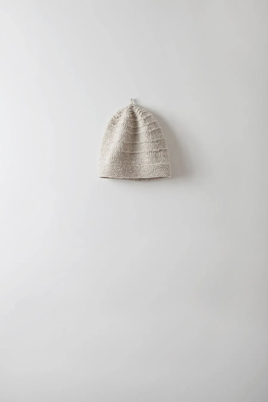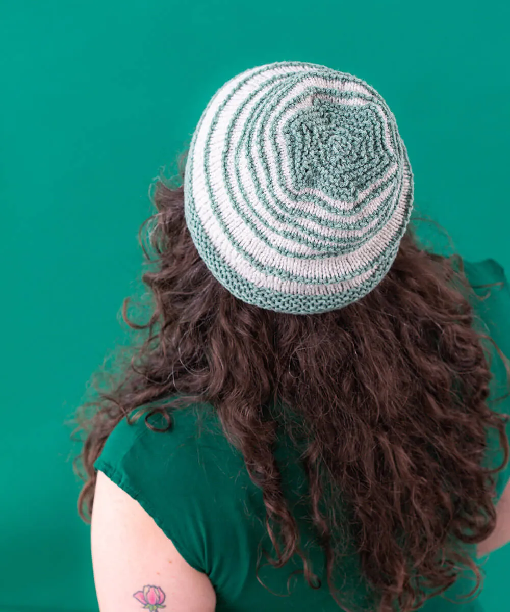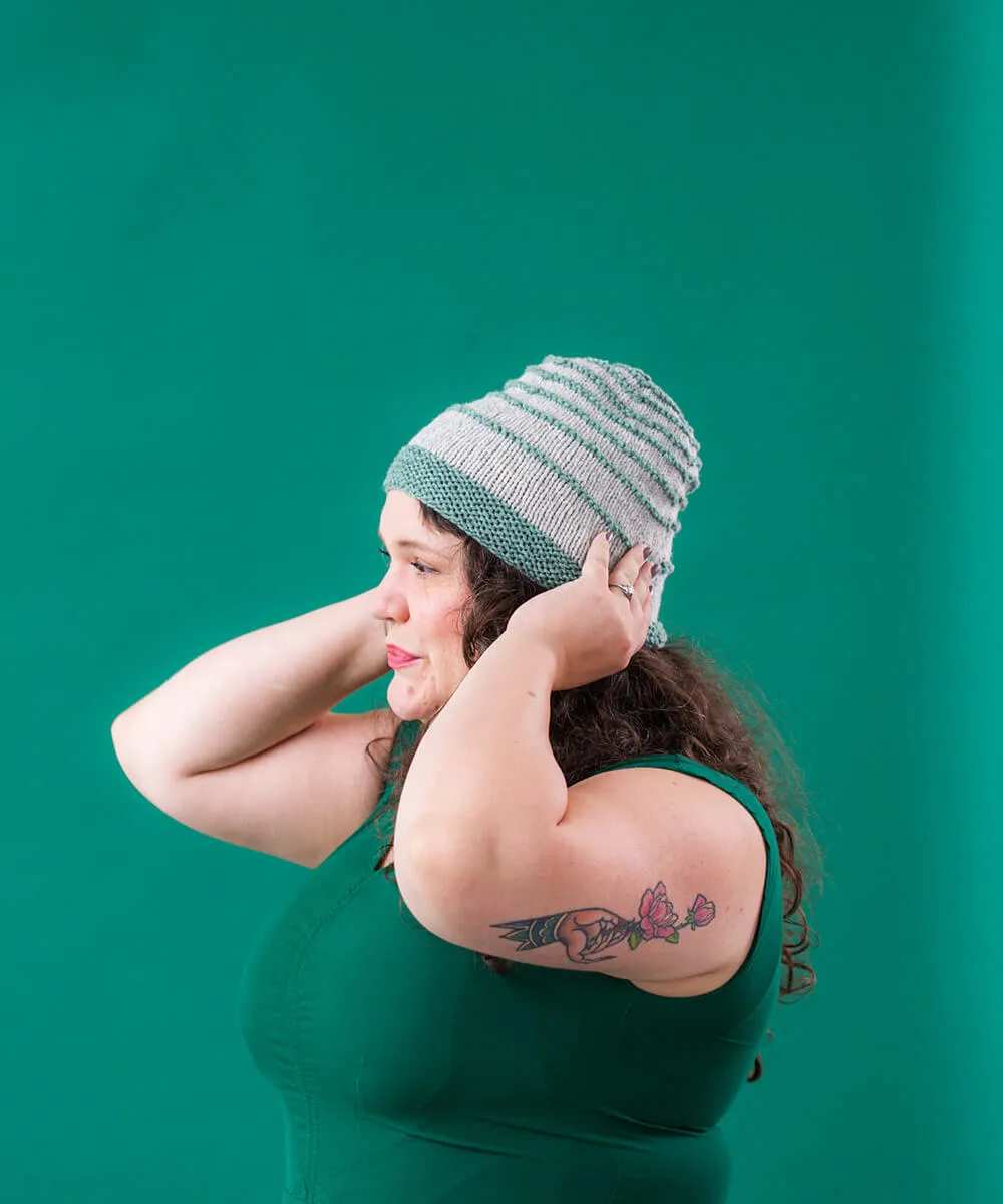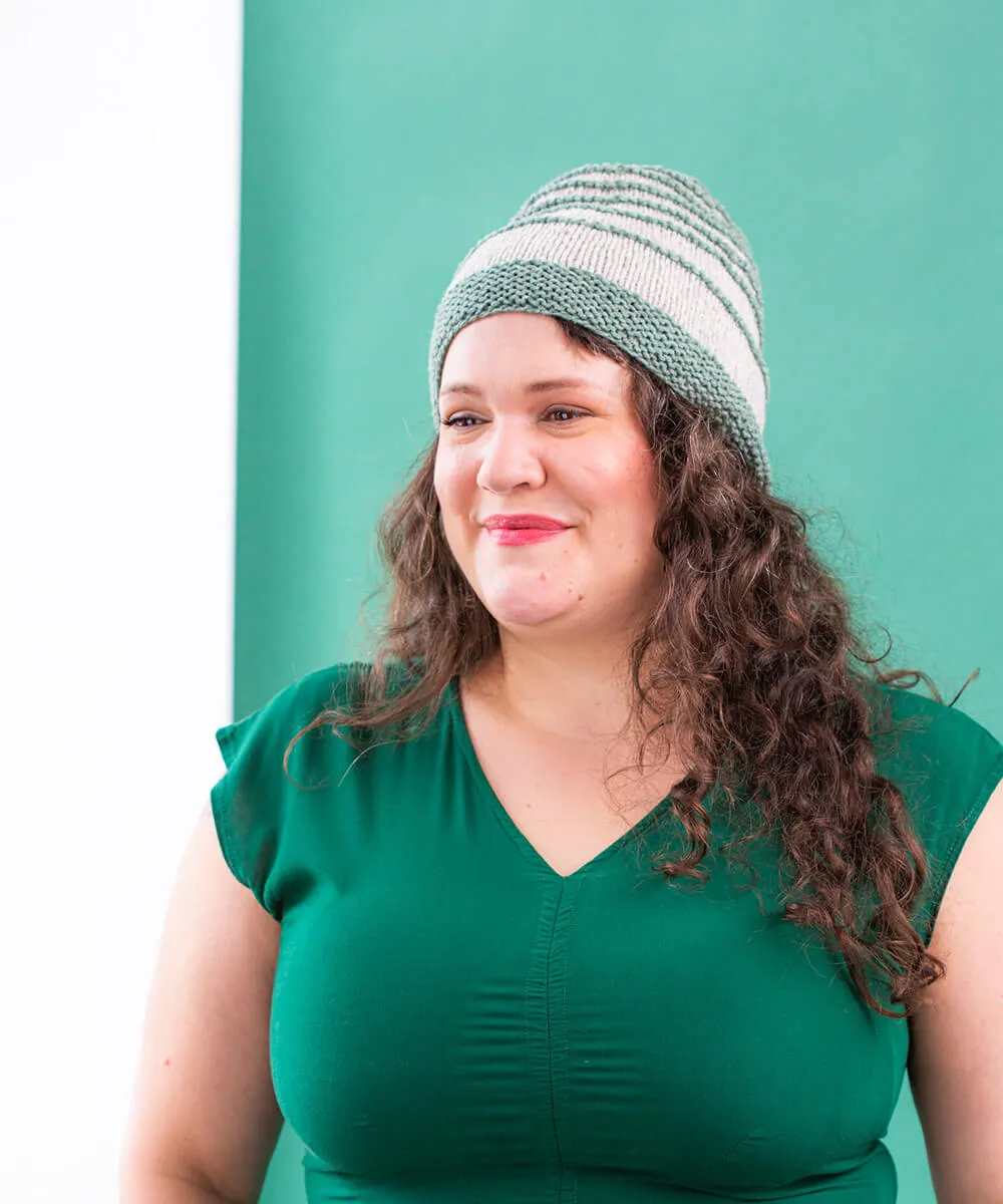 “This hat was inspired by cozy Scandinavian simplicity, and I hope to wear it someday on an adventure in the fjords of Norway. Purled ridges came into the design as a way of hiding the decrease rows that give this hat its special just-slouchy-enough fit, and the tonal striped look was an added bonus. The garter stitch star shape at the top of the hat is formed by a simple arrangement of decreases. My design and construction philosophy tends toward keeping things as simple as possible without sacrificing special details.” – Jenny Gordy