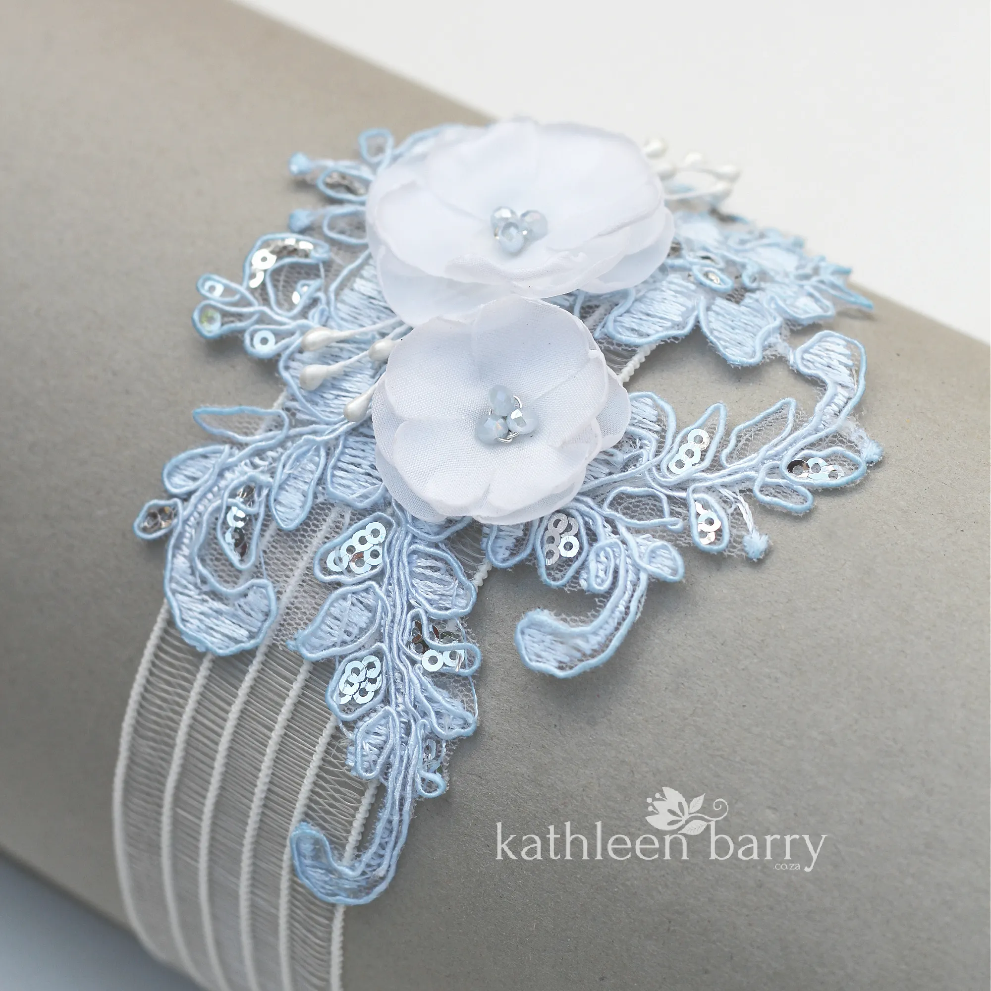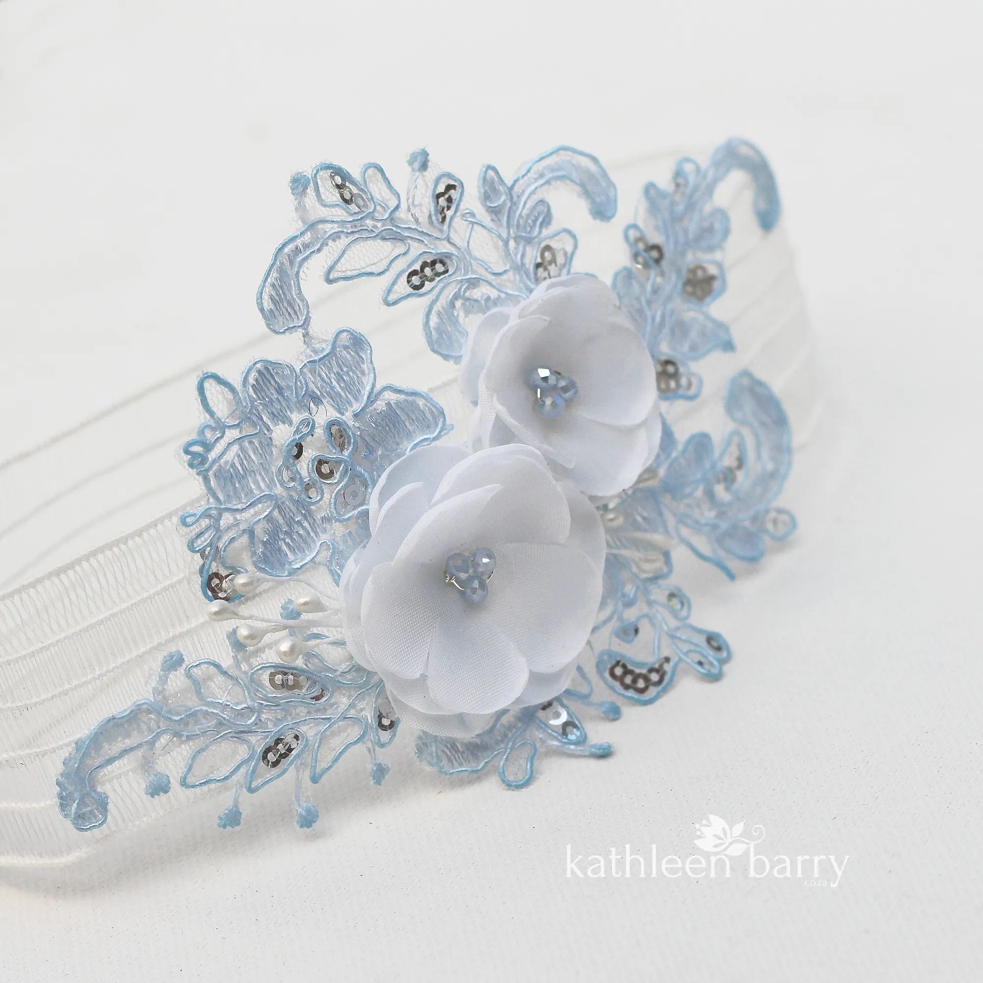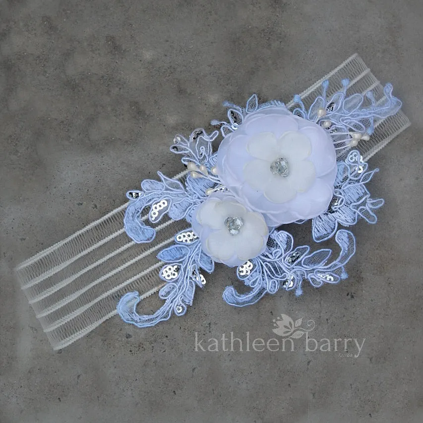 This heirloom garter has been hand crafted with limited edition, hand dyed corded bridal lace with silver micro sequins. Soft white or ivory 3D handmade fabric flowers and Czech glass pearl or crystal centers to match lace color.
