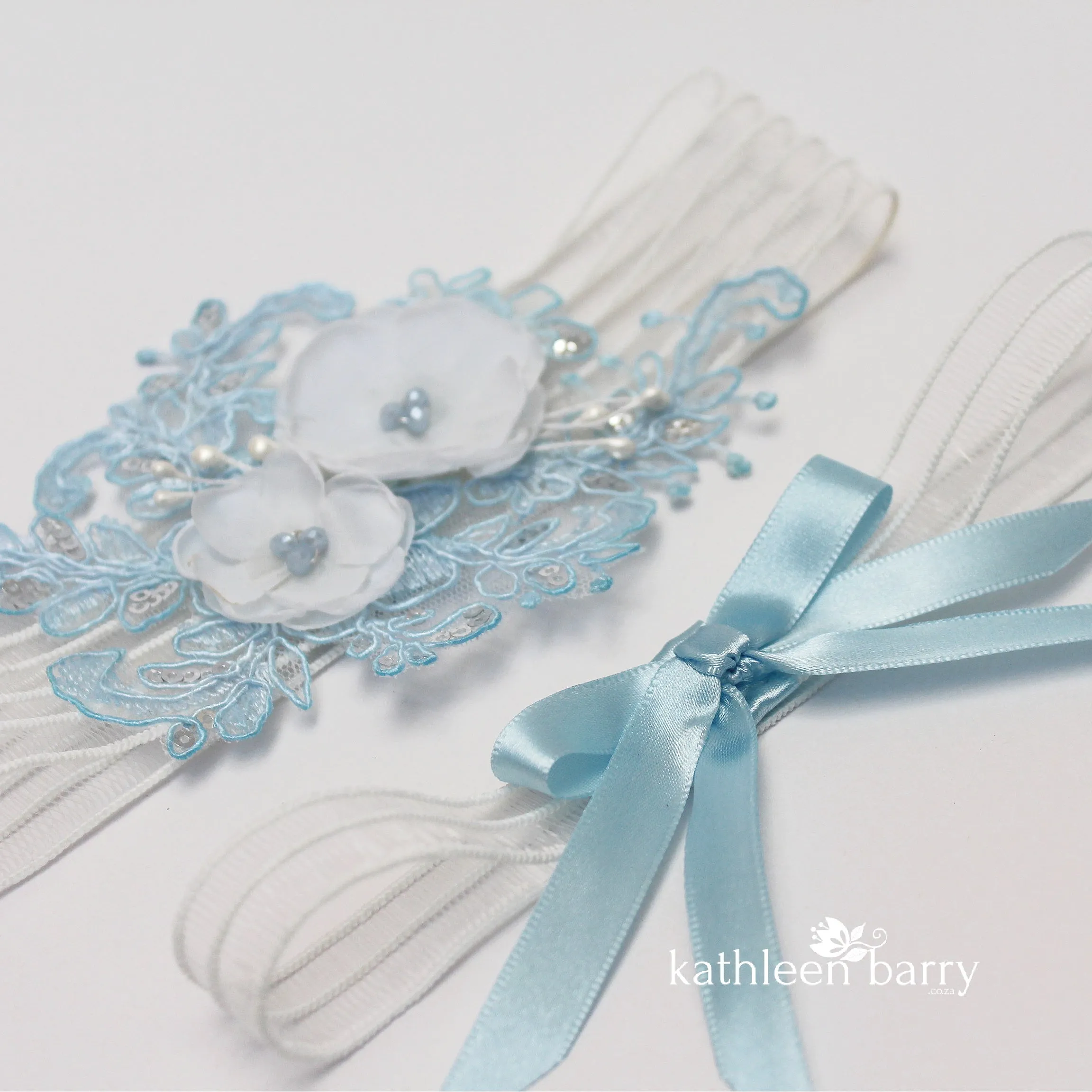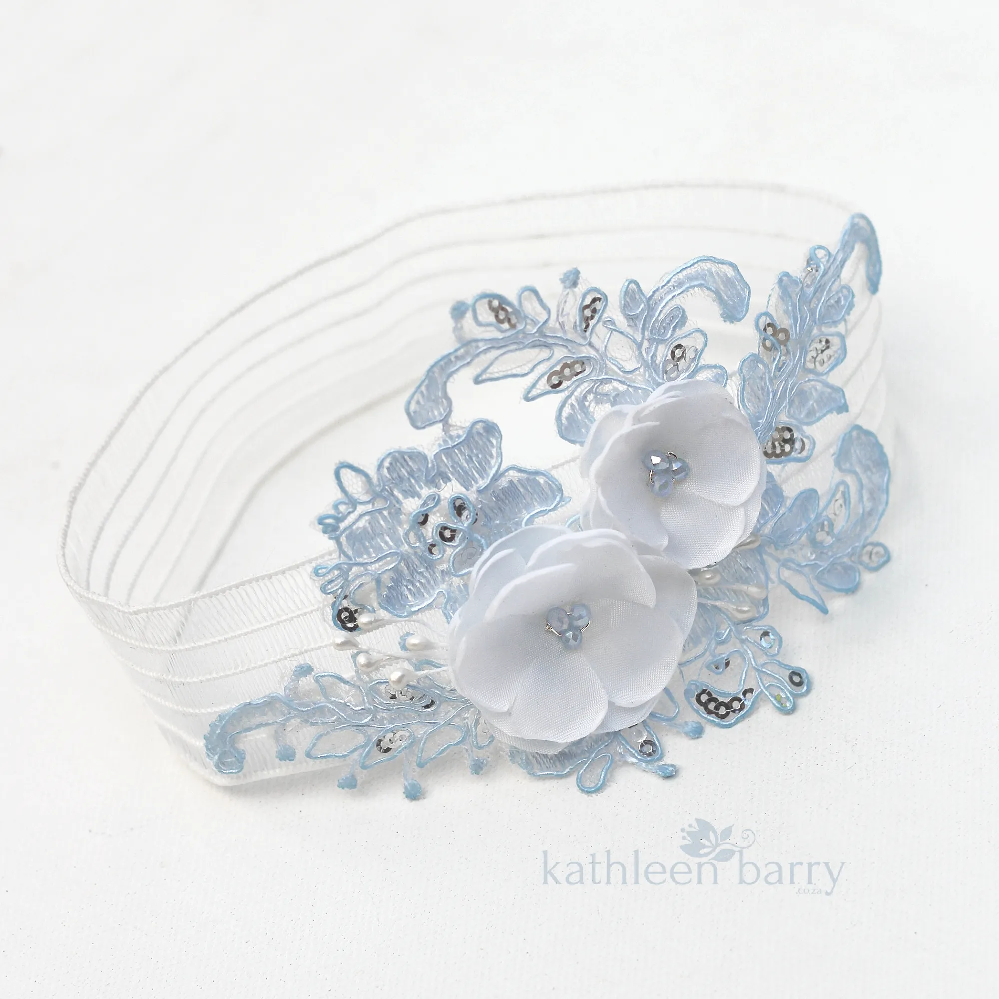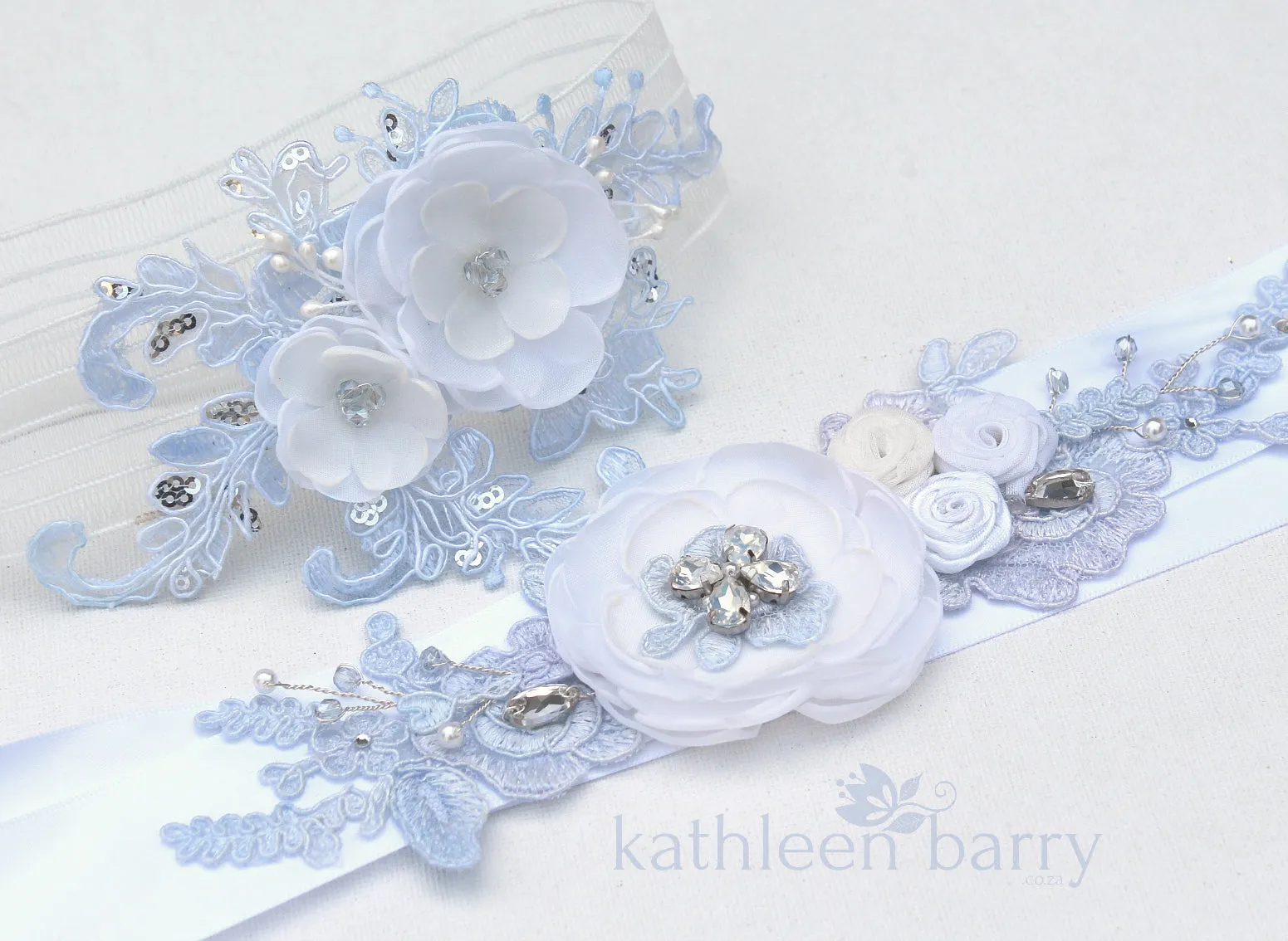 This heirloom garter has been hand crafted with limited edition, hand dyed corded bridal lace with silver micro sequins. Soft white or ivory 3D handmade fabric flowers and Czech glass pearl or crystal centers to match lace color.