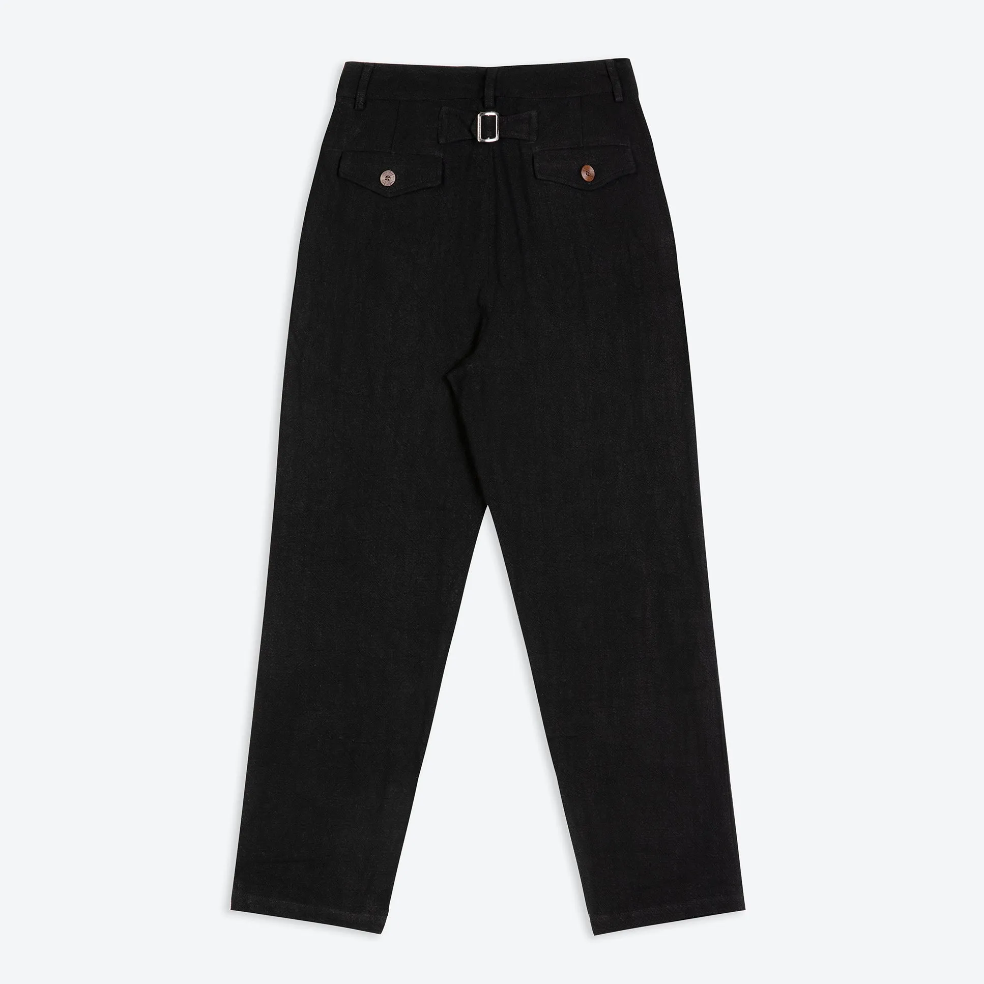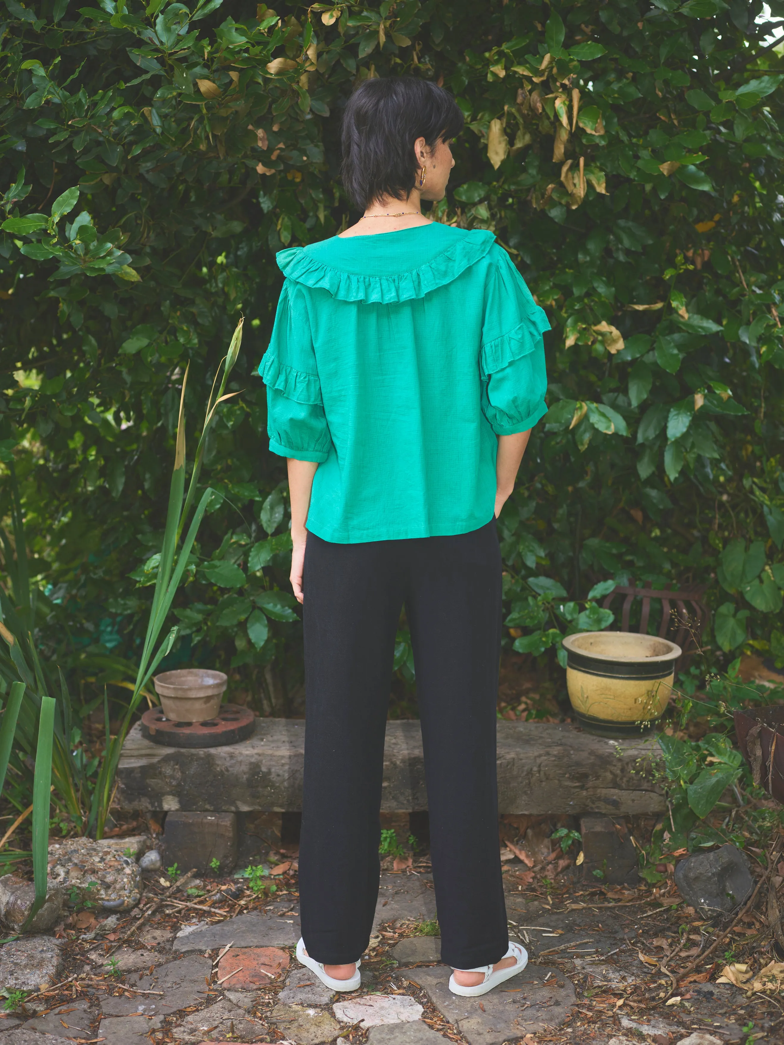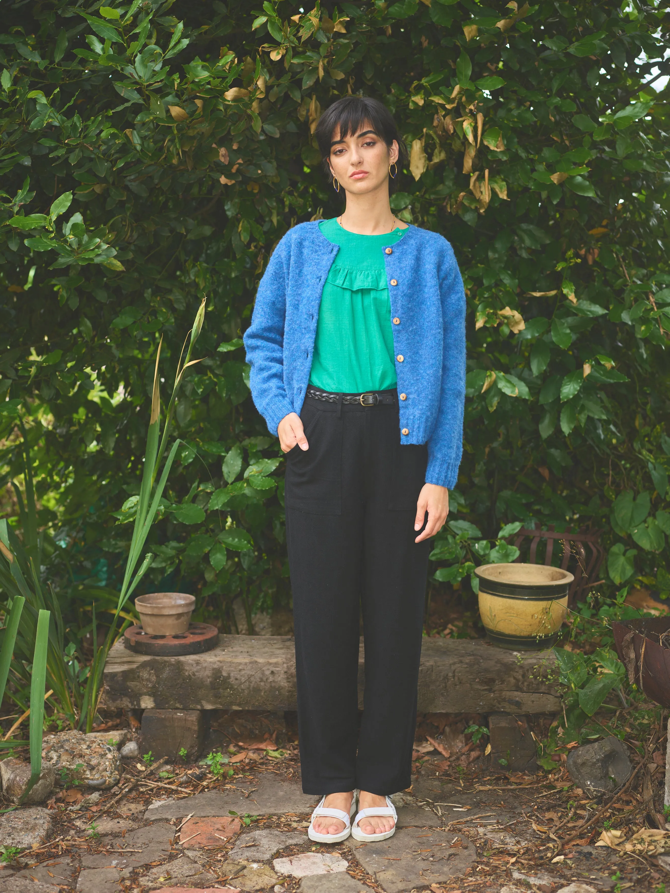 Crafted from sumptuous linen viscose, these classic Natalie trousers reflects Lowie’s fusion of traditional and contemporary style. Sitting high on the waist, they feature two front pleats and tapered legs which give a flattering, longline silhouette. Finished with side pockets, wooden button and zipper closure. Also available in emerald green.