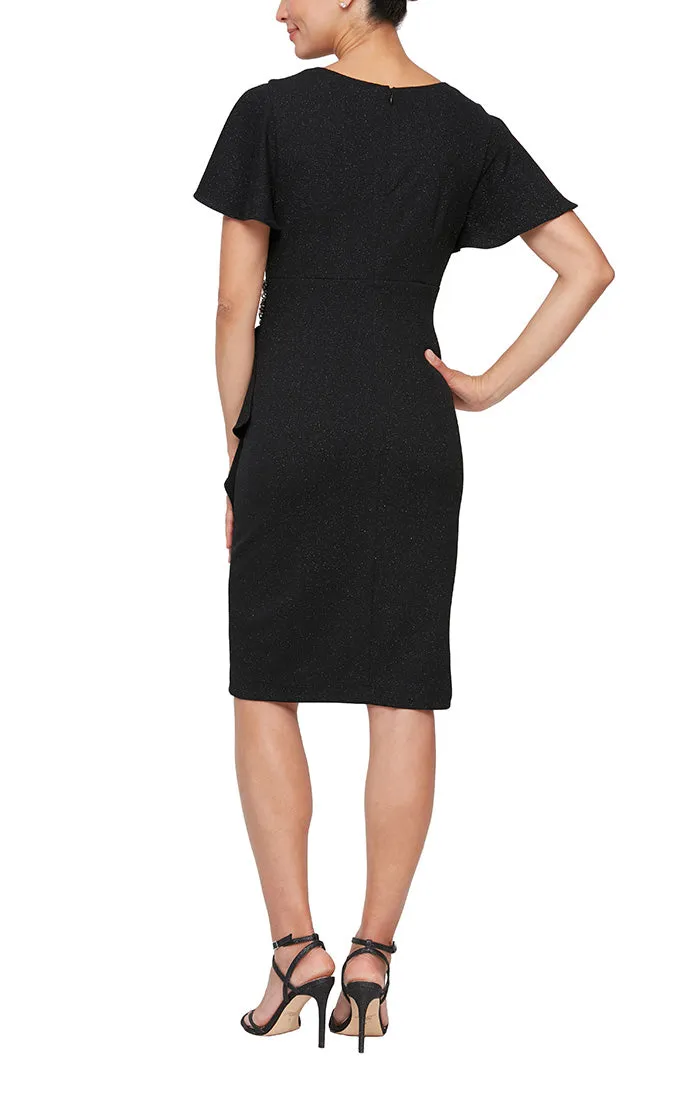 This metallic knit dress features a surplice neckline, short flutter sleeves, and a detailed embellishment at the hip, creating a sleek and stylish design in our stretchy, shimmering fabric.