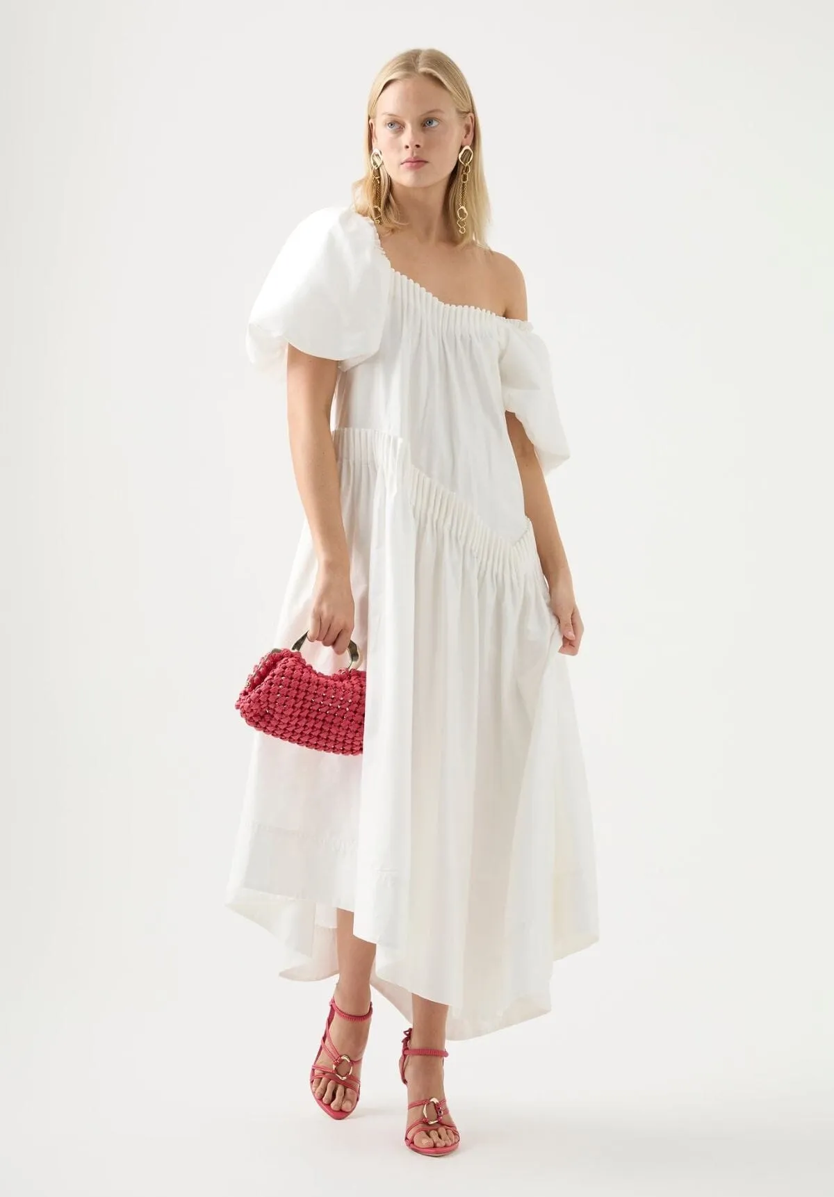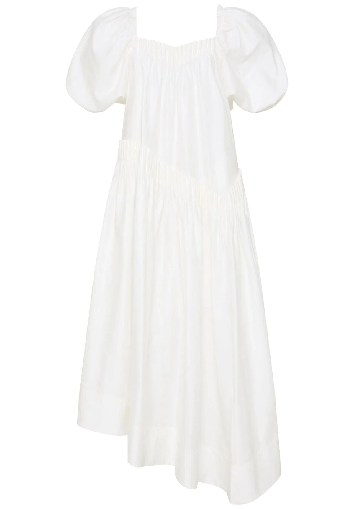 The unexpected shape of this smock dress defies traditional forms through an asymmetric hem, panelling and cartridge pleating. The structured form of the pleats are juxtaposed against the floaty midi skirt and puff sleeves to create a maximal impact silhouette.