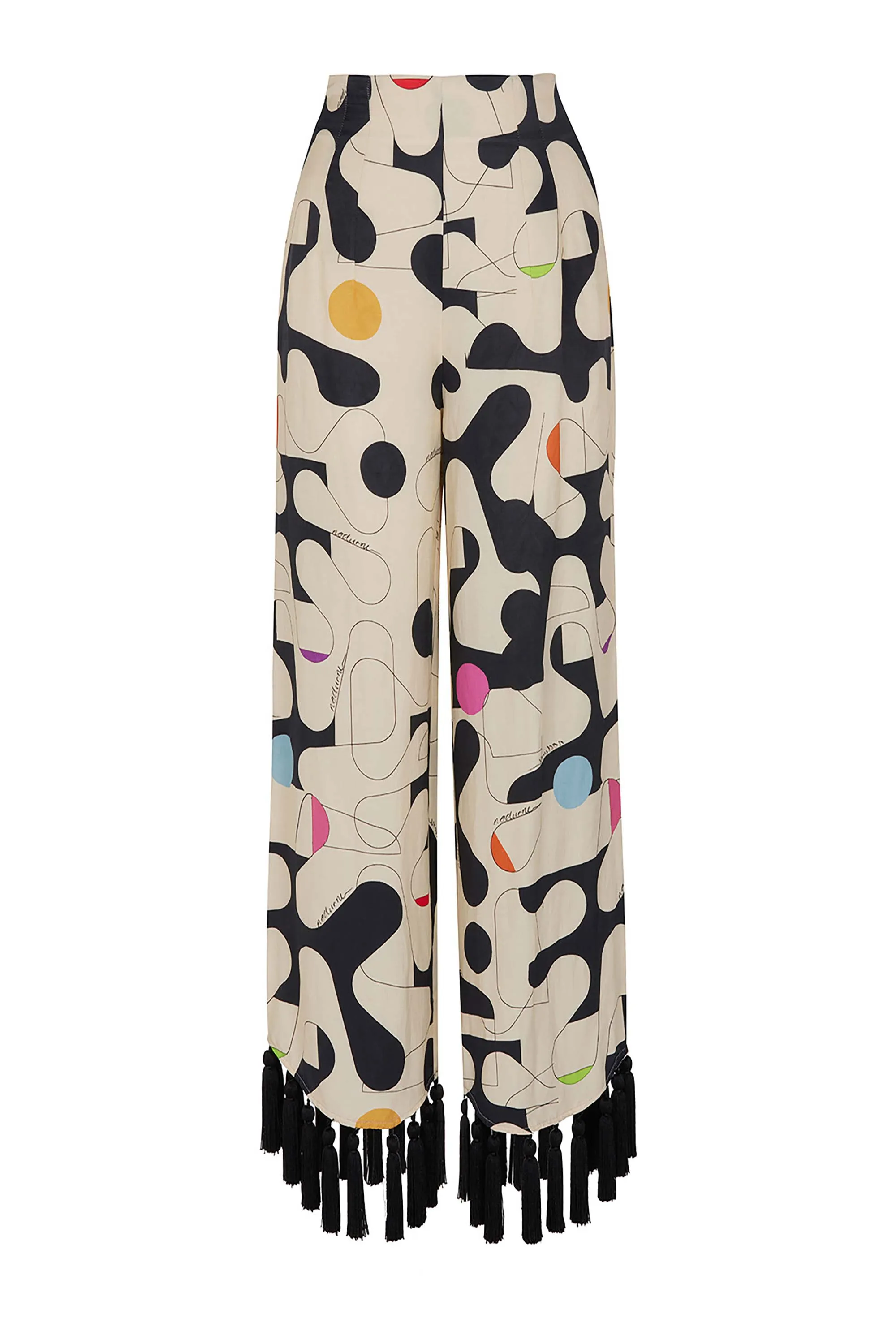 Wide-leg printed pants with tassels at hem. Hidden in-seam zip closure.
