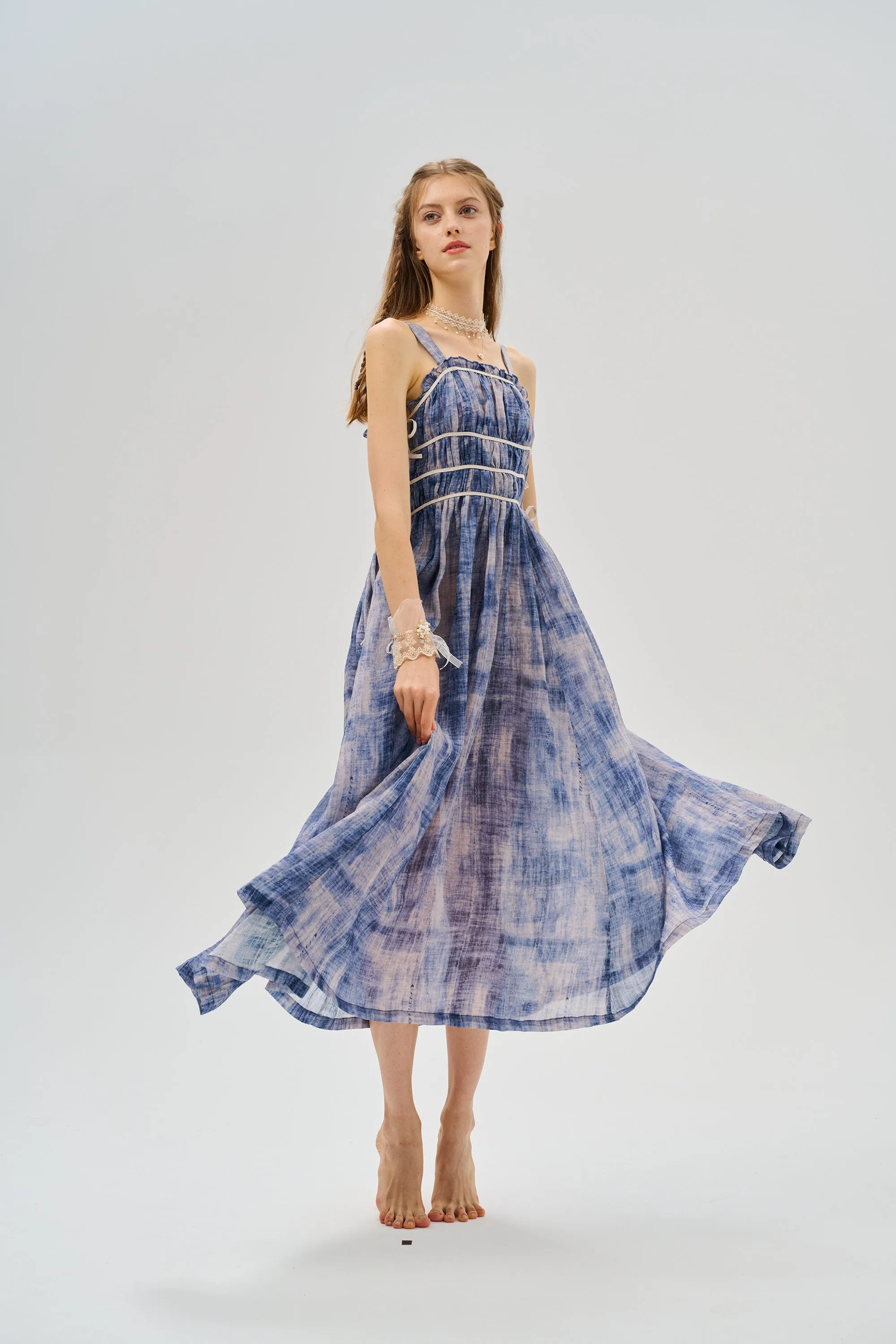 With its whimsical silhouette and fairy-tale allure, this refreshing sleeveless day outfit is versatile for any sunny occasion, such as a picnic, garden party or beach outing.
