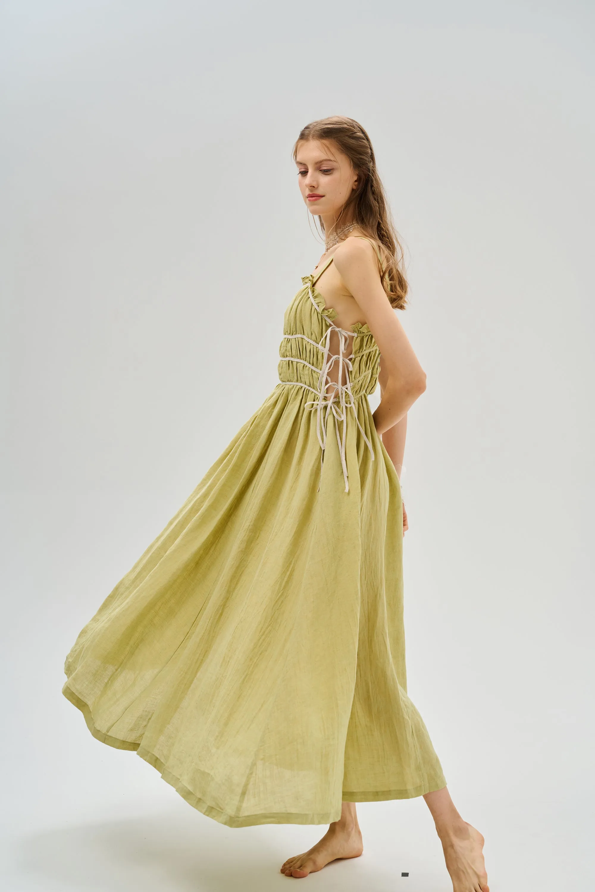 This dress features playful ruffles, elegant pleats, delicate adjustable lace-up and a flowing silhouette that add an extra touch of femininity. So flattering!